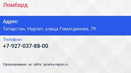 Ломбард по адресу Татарстан, Нурлат, улица Гиматдинова, 79 в дальнейшем Организация, размещена в следующих категориях: