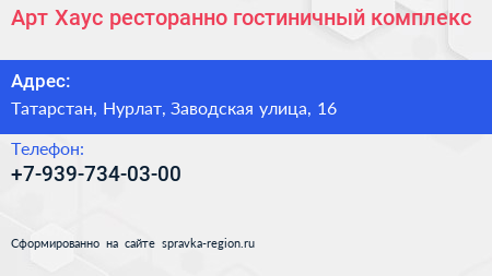Арт Хаус, ресторанно-гостиничный комплекс по адресу Татарстан, Нурлат, Заводская улица, 16 в дальнейшем Организация, размещена в следующих категориях: