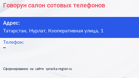 Говорун, салон сотовых телефонов по адресу Татарстан, Нурлат, Кооперативная улица, 1 в дальнейшем Организация, размещена в следующих категориях: