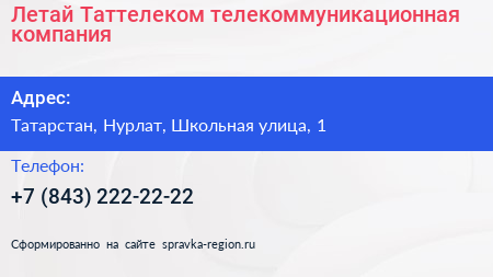 Летай Таттелеком, телекоммуникационная компания по адресу Татарстан, Нурлат, Школьная улица, 1 в дальнейшем Организация, размещена в следующих категориях: