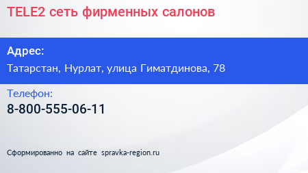 TELE2, сеть фирменных салонов по адресу Татарстан, Нурлат, улица Гиматдинова, 78 в дальнейшем Организация, размещена в следующих категориях: