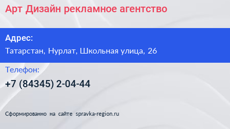 Арт Дизайн, рекламное агентство по адресу Татарстан, Нурлат, Школьная улица, 26 в дальнейшем Организация, размещена в следующих категориях: