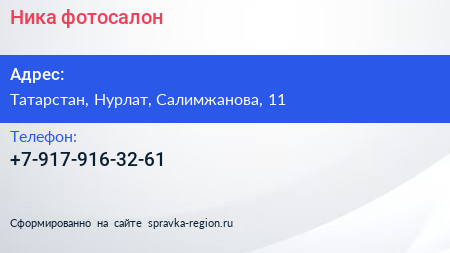 Ника, фотосалон по адресу Татарстан, Нурлат, Салимжанова, 11 в дальнейшем Организация, размещена в следующих категориях: