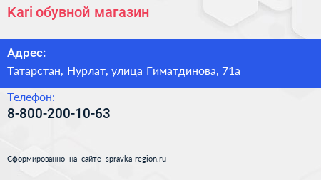 Kari, обувной магазин по адресу Татарстан, Нурлат, улица Гиматдинова, 71а в дальнейшем Организация, размещена в следующих категориях: