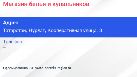 Магазин белья и купальников по адресу Татарстан, Нурлат, Кооперативная улица, 3 в дальнейшем Организация, размещена в следующих категориях:
