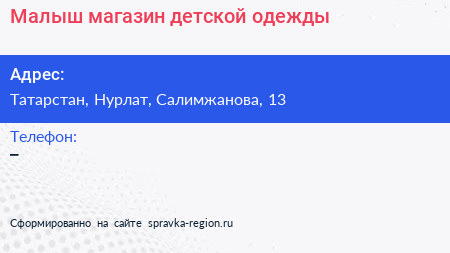 Малыш, магазин детской одежды по адресу Татарстан, Нурлат, Салимжанова, 13 в дальнейшем Организация, размещена в следующих категориях: