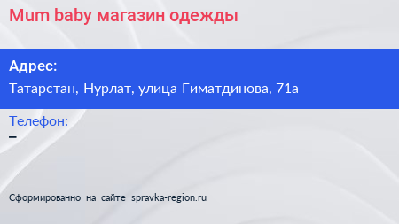 Mum & baby, магазин одежды по адресу Татарстан, Нурлат, улица Гиматдинова, 71а в дальнейшем Организация, размещена в следующих категориях: