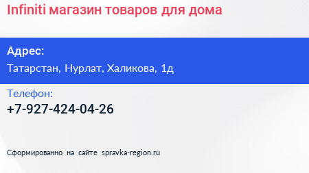 Infiniti, магазин товаров для дома по адресу Татарстан, Нурлат, Халикова, 1д в дальнейшем Организация, размещена в следующих категориях:
