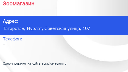 Зоомагазин по адресу Татарстан, Нурлат, Советская улица, 107 в дальнейшем Организация, размещена в следующих категориях:
