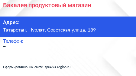 Бакалея, продуктовый магазин по адресу Татарстан, Нурлат, Советская улица, 189 в дальнейшем Организация, размещена в следующих категориях: