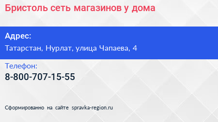 Бристоль, сеть магазинов у дома по адресу Татарстан, Нурлат, улица Чапаева, 4 в дальнейшем Организация, размещена в следующих категориях: