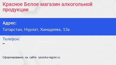 Красное & Белое, магазин алкогольной продукции по адресу Татарстан, Нурлат, Хамадеева, 13а в дальнейшем Организация, размещена в следующих категориях: