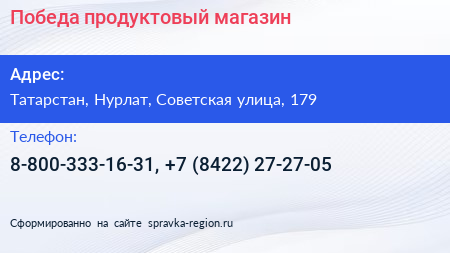 Победа, продуктовый магазин по адресу Татарстан, Нурлат, Советская улица, 179 в дальнейшем Организация, размещена в следующих категориях: