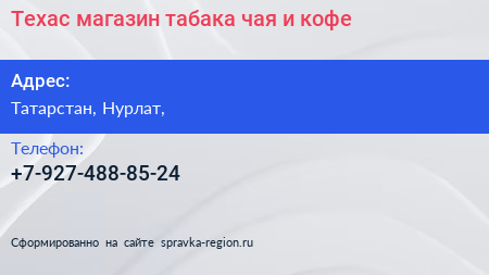 Техас, магазин табака, чая и кофе по адресу Татарстан, Нурлат, в дальнейшем Организация, размещена в следующих категориях: