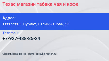 Техас, магазин табака, чая и кофе по адресу Татарстан, Нурлат, Салимжанова, 13 в дальнейшем Организация, размещена в следующих категориях: