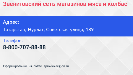 Звениговский, сеть магазинов мяса и колбас по адресу Татарстан, Нурлат, Советская улица, 189 в дальнейшем Организация, размещена в следующих категориях: