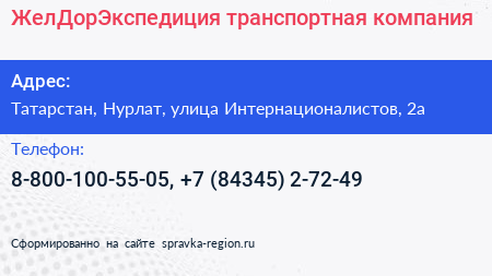 ЖелДорЭкспедиция, транспортная компания по адресу Татарстан, Нурлат, улица Интернационалистов, 2а в дальнейшем Организация, размещена в следующих категориях: