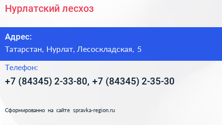 Нурлатский лесхоз по адресу Татарстан, Нурлат, Лесоскладская, 5 в дальнейшем Организация, размещена в следующих категориях: