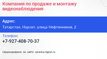 Компания по продаже и монтажу видеонаблюдения по адресу Татарстан, Нурлат, улица Нефтянников, 2 в дальнейшем Организация, размещена в следующих категориях: