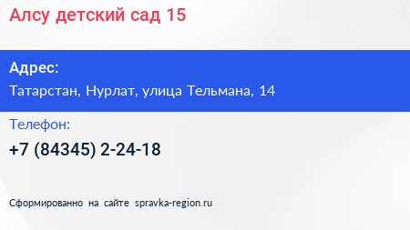 Алсу, детский сад №15 по адресу Татарстан, Нурлат, улица Тельмана, 14 в дальнейшем Организация, размещена в следующих категориях: