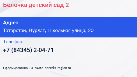 Белочка, детский сад №2 по адресу Татарстан, Нурлат, Школьная улица, 20 в дальнейшем Организация, размещена в следующих категориях: