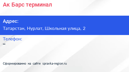 Ак Барс, терминал по адресу Татарстан, Нурлат, Школьная улица, 2 в дальнейшем Организация, размещена в следующих категориях: