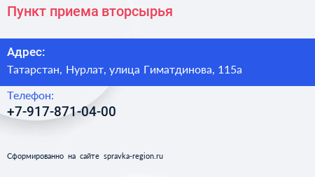 Пункт приема вторсырья по адресу Татарстан, Нурлат, улица Гиматдинова, 115а в дальнейшем Организация, размещена в следующих категориях: