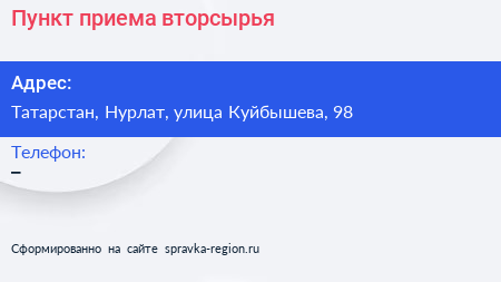 Пункт приема вторсырья по адресу Татарстан, Нурлат, улица Куйбышева, 98 в дальнейшем Организация, размещена в следующих категориях: