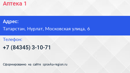 Аптека №1 по адресу Татарстан, Нурлат, Московская улица, 6 в дальнейшем Организация, размещена в следующих категориях: