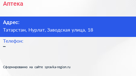 Аптека по адресу Татарстан, Нурлат, Заводская улица, 18 в дальнейшем Организация, размещена в следующих категориях: