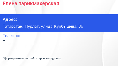 Елена, парикмахерская по адресу Татарстан, Нурлат, улица Куйбышева, 36 в дальнейшем Организация, размещена в следующих категориях: