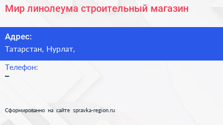 Мир линолеума, строительный магазин по адресу Татарстан, Нурлат, в дальнейшем Организация, размещена в следующих категориях: