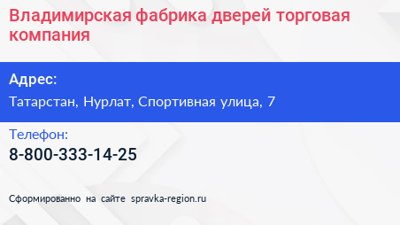 Владимирская фабрика дверей, торговая компания по адресу Татарстан, Нурлат, Спортивная улица, 7 в дальнейшем Организация, размещена в следующих категориях: