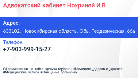 Адвокатский кабинет Нохриной И.В. по адресу 633102, Новосибирская область, Обь, Геодезическая, 66а в дальнейшем Организация, размещена в следующих категориях: