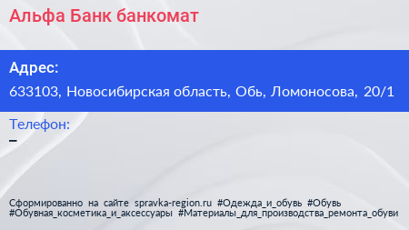 Альфа-Банк, банкомат по адресу 633103, Новосибирская область, Обь, Ломоносова, 20/1 в дальнейшем Организация, размещена в следующих категориях: