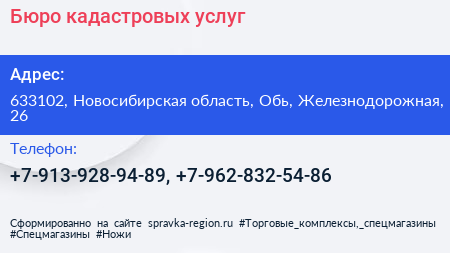 Бюро кадастровых услуг по адресу 633102, Новосибирская область, Обь, Железнодорожная, 26 в дальнейшем Организация, размещена в следующих категориях: