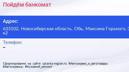 Пойдём!, банкомат по адресу 633102, Новосибирская область, Обь, Максима Горького, 3 к2 в дальнейшем Организация, размещена в следующих категориях: