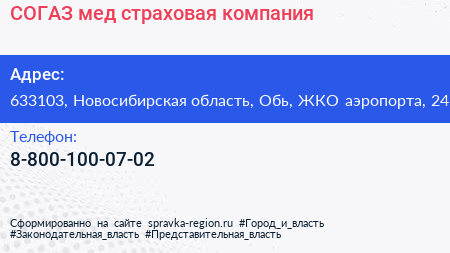 СОГАЗ-мед, страховая компания по адресу 633103, Новосибирская область, Обь, ЖКО аэропорта, 24 в дальнейшем Организация, размещена в следующих категориях: