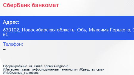СберБанк, банкомат по адресу 633102, Новосибирская область, Обь, Максима Горького, 3 к1 в дальнейшем Организация, размещена в следующих категориях: