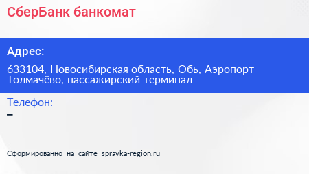 СберБанк, банкомат по адресу 633104, Новосибирская область, Обь, Аэропорт Толмачёво, пассажирский терминал в дальнейшем Организация, размещена в следующих категориях: