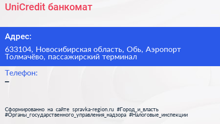 UniCredit, банкомат по адресу 633104, Новосибирская область, Обь, Аэропорт Толмачёво, пассажирский терминал в дальнейшем Организация, размещена в следующих категориях: