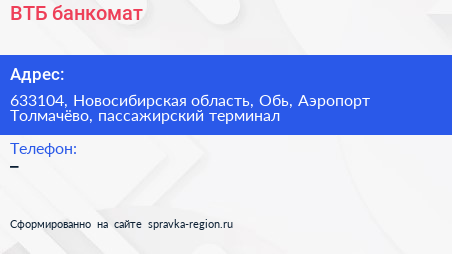 ВТБ, банкомат по адресу 633104, Новосибирская область, Обь, Аэропорт Толмачёво, пассажирский терминал в дальнейшем Организация, размещена в следующих категориях:
