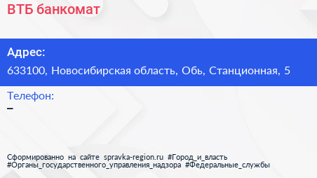 ВТБ, банкомат по адресу 633100, Новосибирская область, Обь, Станционная, 5 в дальнейшем Организация, размещена в следующих категориях: