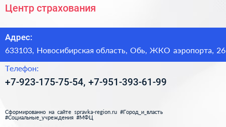 Центр страхования по адресу 633103, Новосибирская область, Обь, ЖКО аэропорта, 26 в дальнейшем Организация, размещена в следующих категориях: