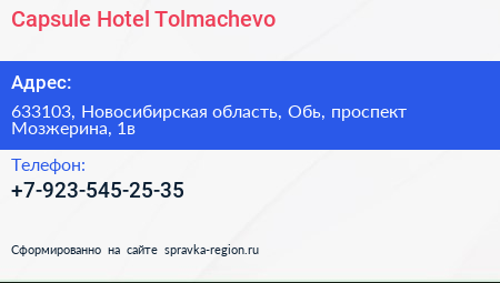 Capsule Hotel Tolmachevo по адресу 633103, Новосибирская область, Обь, проспект Мозжерина, 1в в дальнейшем Организация, размещена в следующих категориях: