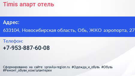 Timis, апарт-отель по адресу 633104, Новосибирская область, Обь, ЖКО аэропорта, 27 в дальнейшем Организация, размещена в следующих категориях: