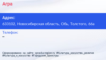 Агра по адресу 633102, Новосибирская область, Обь, Толстого, 66а в дальнейшем Организация, размещена в следующих категориях: