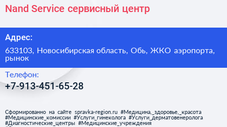 Nand Service, сервисный центр по адресу 633103, Новосибирская область, Обь, ЖКО аэропорта, рынок в дальнейшем Организация, размещена в следующих категориях: