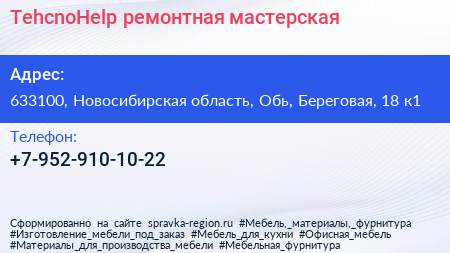 TehcnoHelp, ремонтная мастерская по адресу 633100, Новосибирская область, Обь, Береговая, 18 к1 в дальнейшем Организация, размещена в следующих категориях: