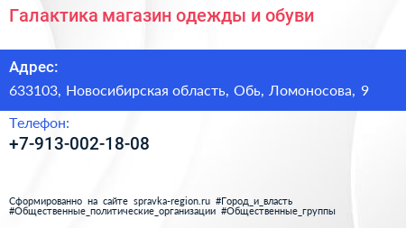 Галактика, магазин одежды и обуви по адресу 633103, Новосибирская область, Обь, Ломоносова, 9 в дальнейшем Организация, размещена в следующих категориях: